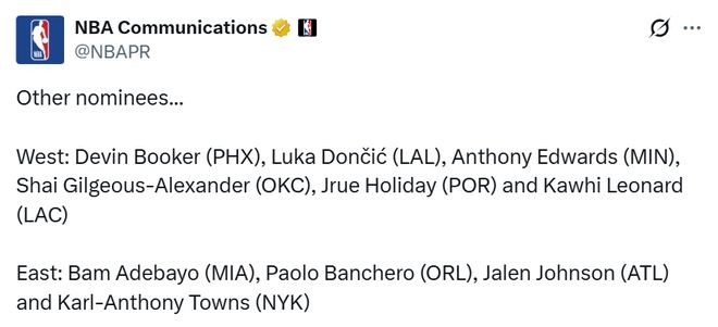 西部:德文-布克(太陽)、盧卡-東契奇(湖人)、安東尼-愛德華茲(森林狼)、亞曆山大(雷霆)、朱-霍勒迪(開拓者)、科懷-萊昂納德(快船)