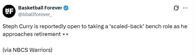 庫裏短期內並沒有退役的計劃,他依然處在精英水準。但當他的狀態真的開始下滑(他今年37歲),庫裏不會固執地死守主力位置。相反,他會接受球隊裏更次要的角色,努力以替補身份繼續發揮作用。幸運的是,他的打法幾乎不受年齡限製,他的投籃永遠具備價值。