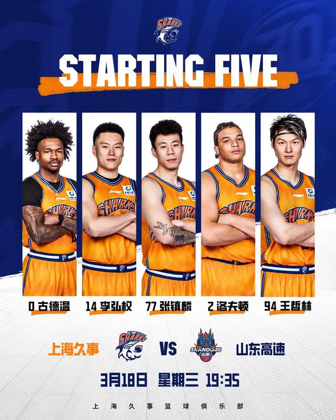 此役大鯊魚先發五人與上一輪麵對青島沒有任何變化,依舊為:古德溫、李弘權、張鎮麟、洛夫頓和王哲林。