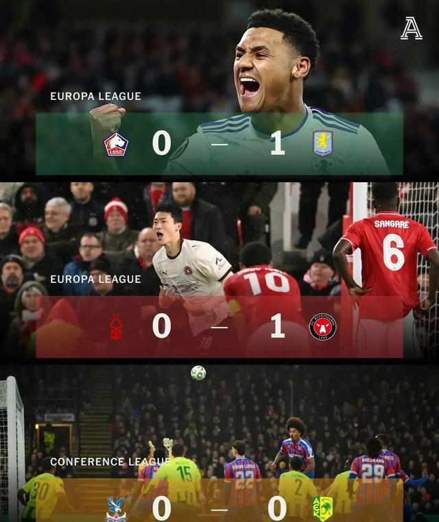 再來看向歐聯杯和歐協聯,阿斯頓維拉客場1-0驚險小勝法甲勁旅裏爾,憑借第61分鍾沃特金斯的製勝進球,為英超球隊保住了最後的臉麵。